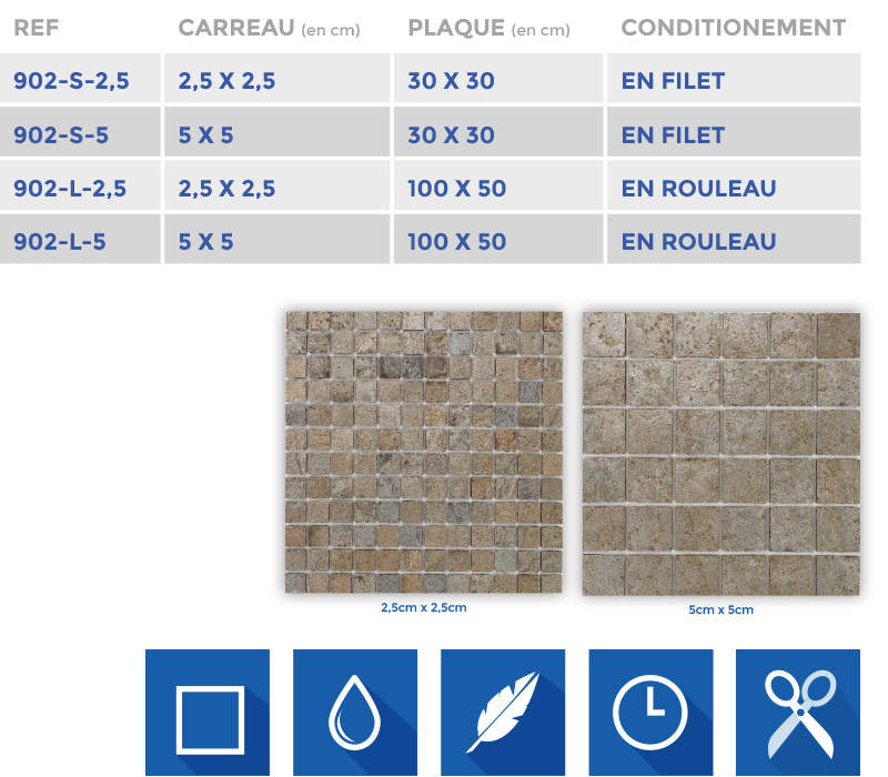 Eternellement élégante, la pierre naturelle trouve une place logique dans notre gamme de mosaïque. Nous utilisons pour ce procédé l’alliage de slices de pierre de fine épaisseur et un procédé de collage sur natte étanche qui apportera praticité, rapidité d’installation, élégance, ainsi qu’une touche de caractère à votre projet. Disponibles en 8 coloris, du monochrome aux camaïeux de couleurs. Nous pouvons réaliser sur demande les mélanges de votre choix.